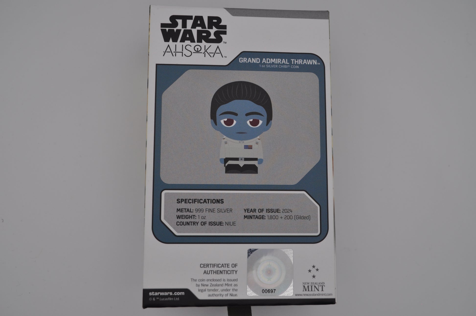 Struck by the New Zealand Mint from 1oz of .999 fine silver, this officially licensed coin features Thrawn in a striking chibi-style design, complete with his signature white uniform and piercing red eyes. With its limited mintage, bold colorization, and themed display box, this piece is as sharp as the character it honors.