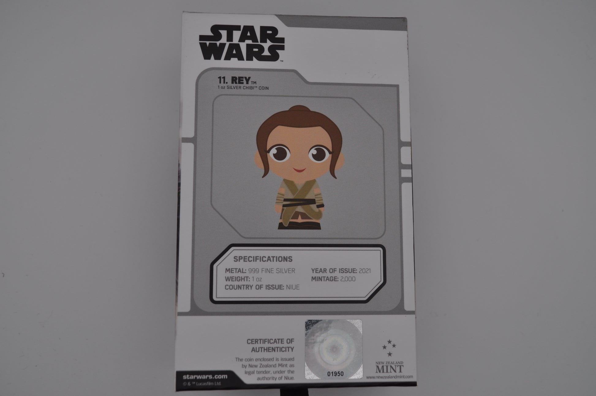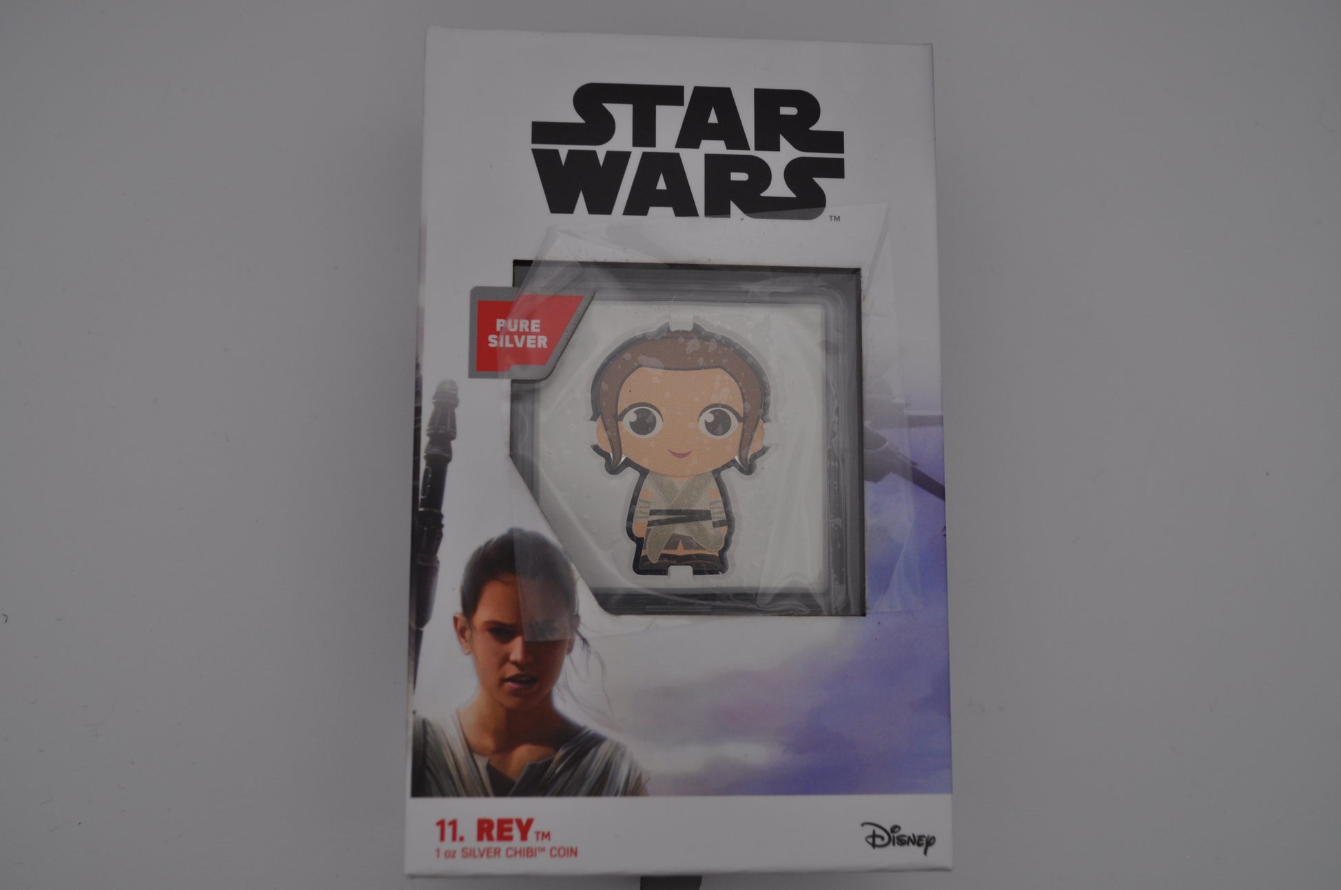This collectible 1oz Chibi® Coin from the New Zealand Mint celebrates Rey™, the resilient hero of the sequel trilogy from the Star Wars™ saga. Struck from 1oz of .999 fine silver, this coin is the 11th release in the popular Chibi® Coin Star Wars Series—and comes in its original presentation box with matching outer sleeve.