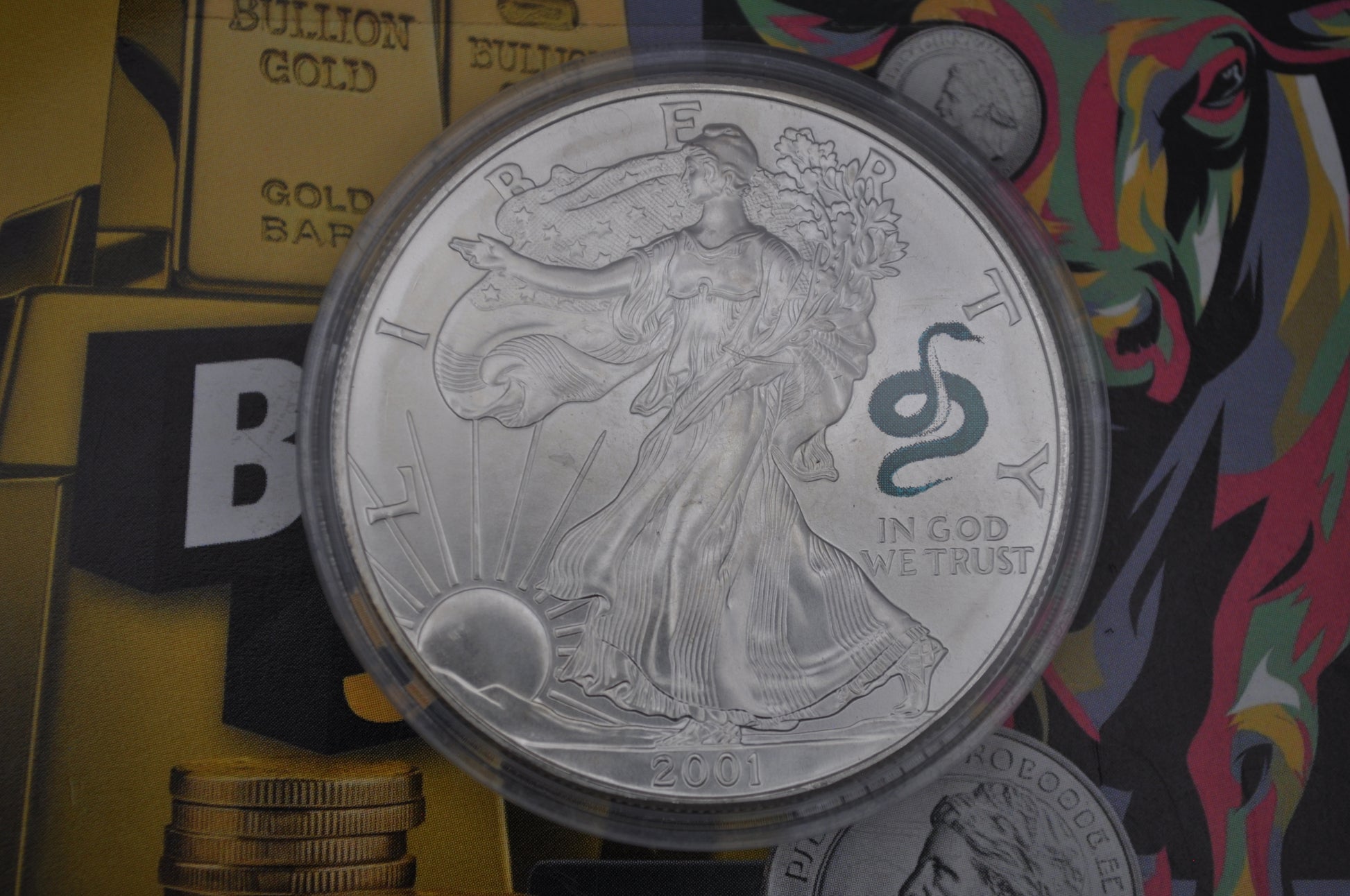 The 2001 1oz American Silver Eagle with Snake Privy Mark is a rare and collectible version of the iconic U.S. bullion coin. Struck from .999 fine silver, this coin features the classic Walking Liberty design along with a special Snake privy mark, celebrating the Year of the Snake in the Chinese Zodiac.