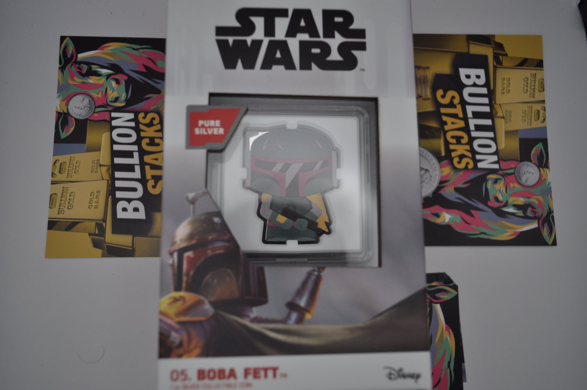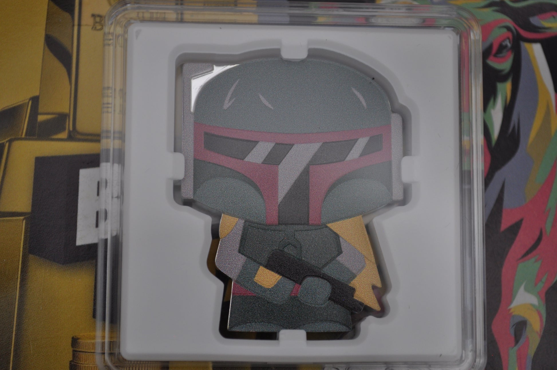 Struck in 1oz of .999 fine silver, this shaped and colorized coin features Boba Fett in full Mandalorian armor, complete with helmet and jetpack — all in the signature Chibi® art style. Each coin comes sealed in a custom Star Wars™-themed display box with a certificate of authenticity, and is limited to only 2,000 pieces worldwide.