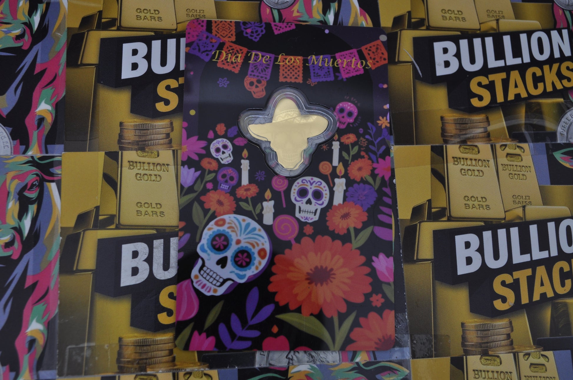 This intricately designed miniature gold coin honors the Mexican Día de los Muertos (Day of the Dead) — a vibrant celebration of ancestors and the cycle of life. The design features a decorative sugar skull motif, symbolizing love, memory, and the beauty of tradition.