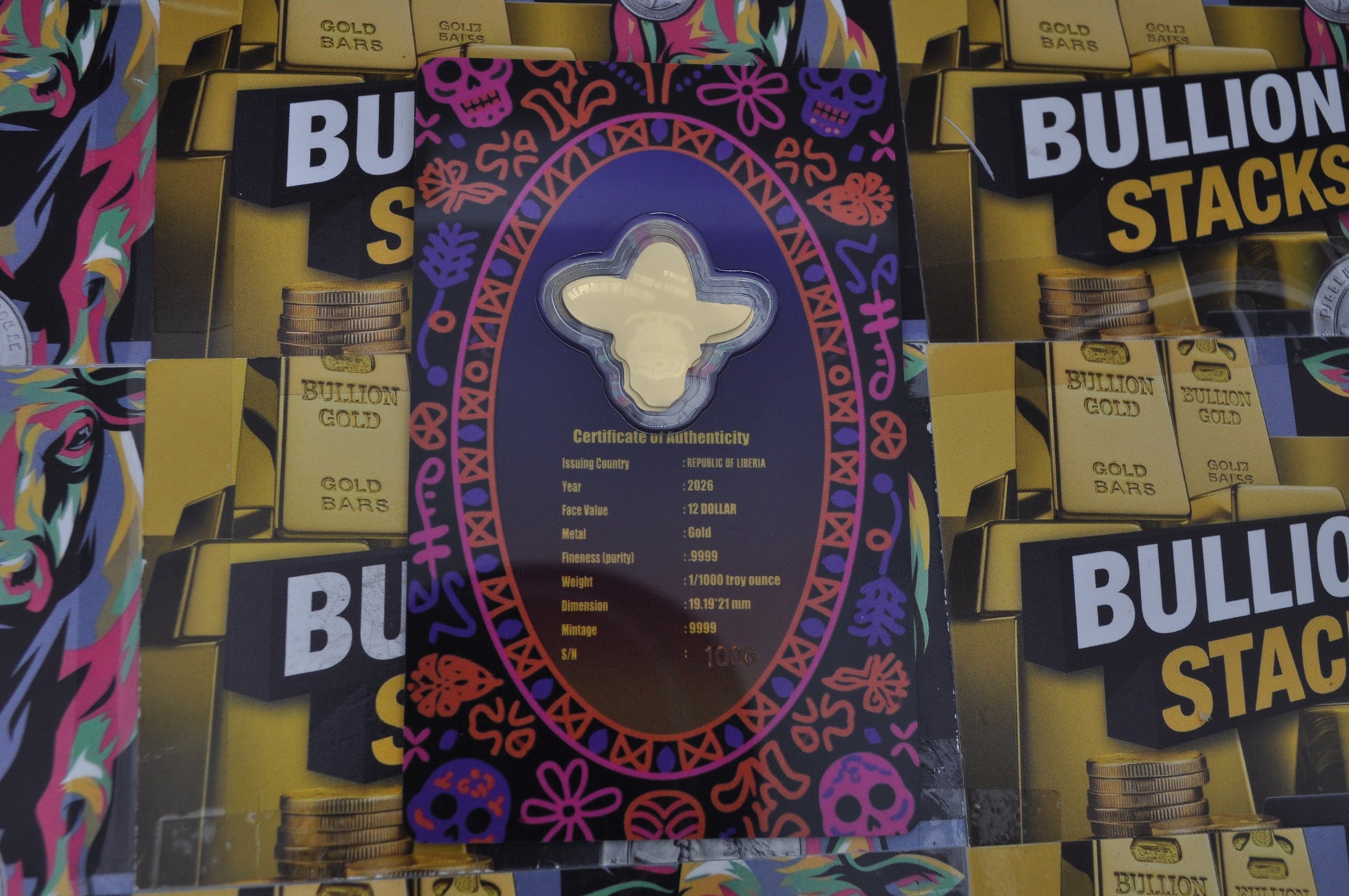 Celebrate life, remembrance, and cultural heritage with the 2026 Republic of Liberia Día de los Muertos 1/1000th oz Gold Coin, struck in .9999 fine gold and beautifully presented in a collectible display card.