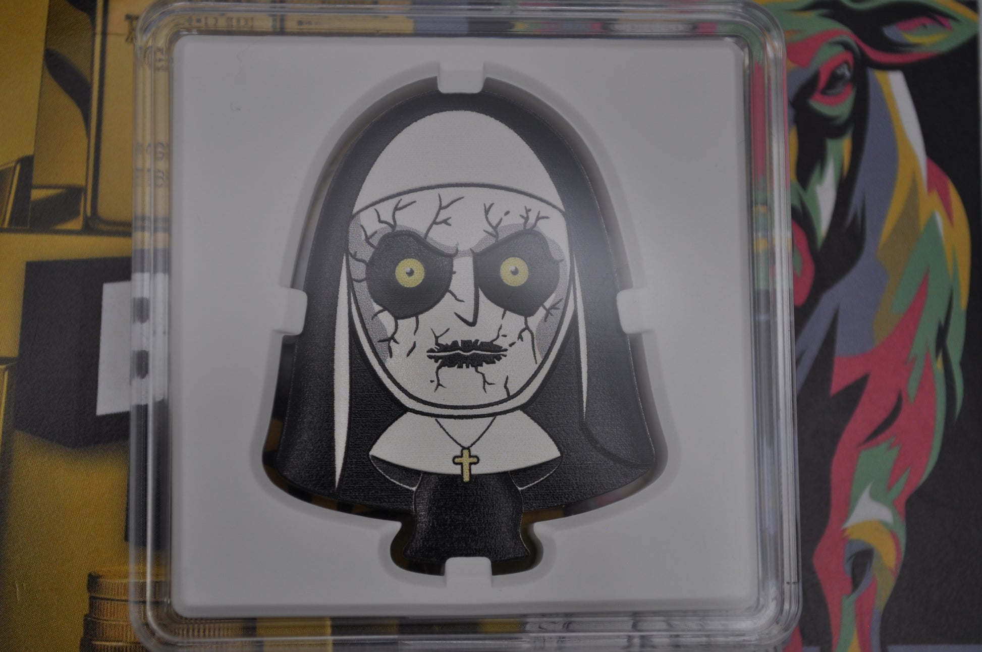Reverse Design: Features Valak, the demonic nun, in stylised chibi form — full-colour with her signature black and white habit, glowing yellow eyes, pale skin, and menacing expression. The coin is shaped to follow her silhouette, finished with sharp proof-like detail.