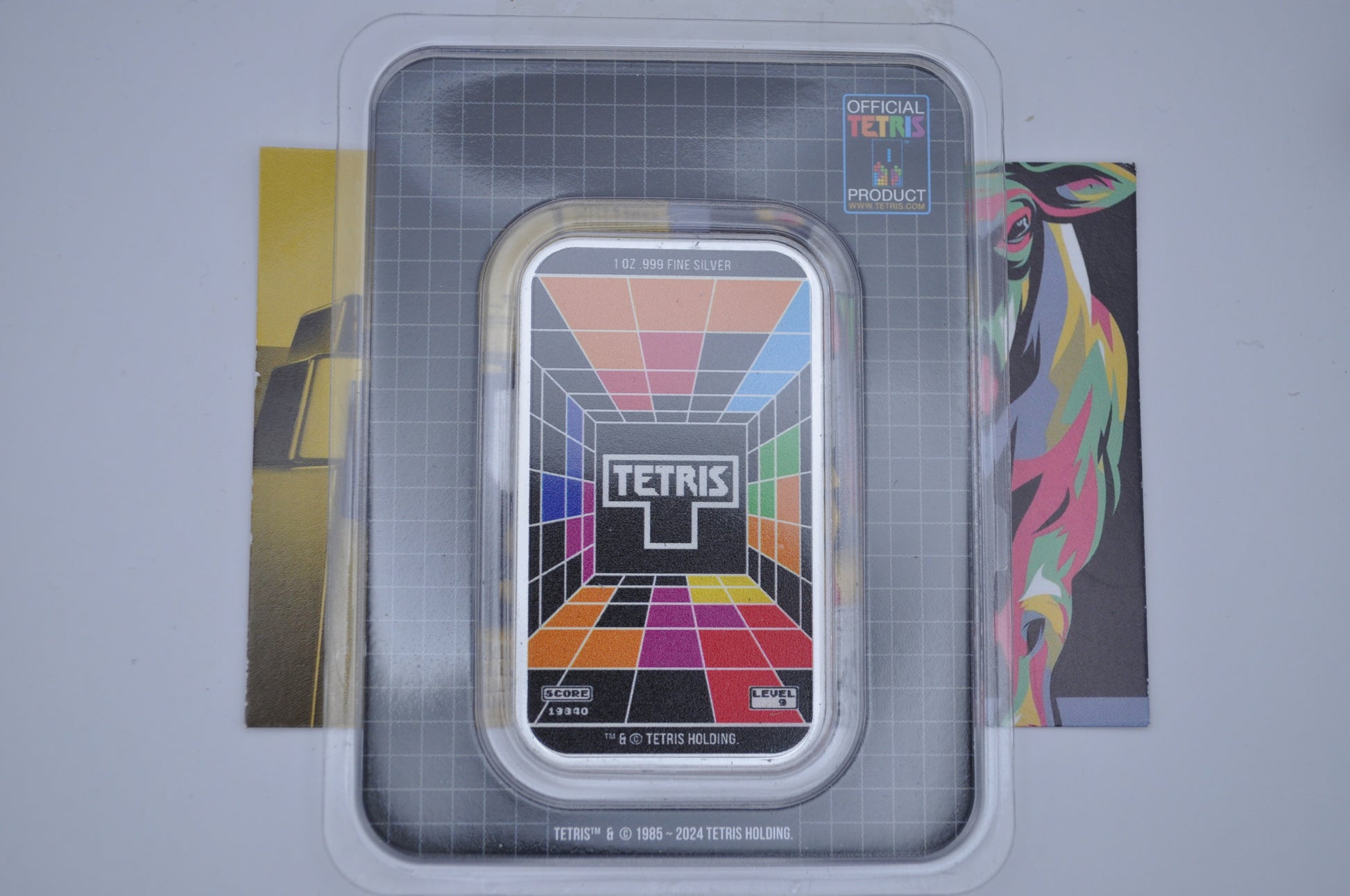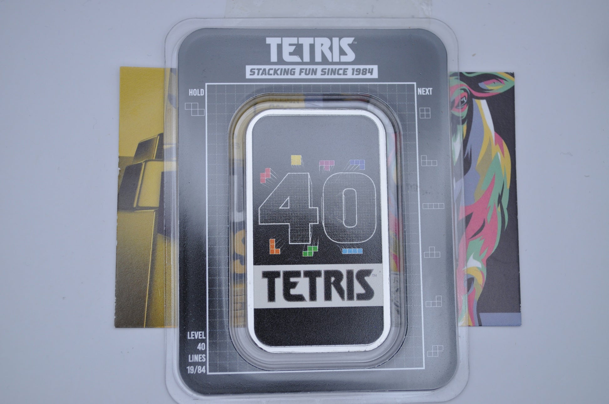 Commemorate four decades of gaming history with the Tetris™ 40th Anniversary 1oz Colorized Silver Bar! Officially licensed and struck from .999 fine silver, this collectible bar features vibrant, full-color artwork inspired by the timeless puzzle game that changed the world.