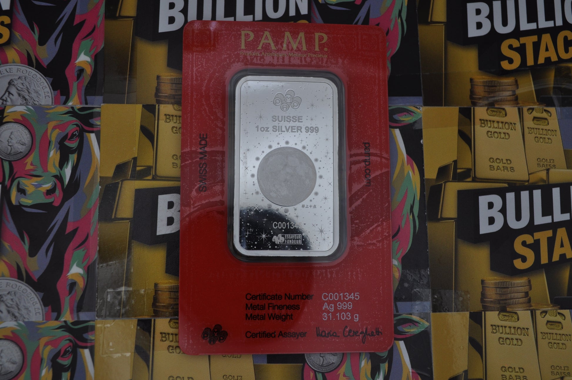 Each bar is sealed in a red, tamper-evident carded assay certifying metal content, weight, and authenticity.